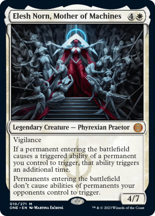 Previews for Phyrexia: All Will Be One kicked off earlier this month. As the Phyrexian threat continues to grow and after seeing Praetors such as Gix, Jin-Jitaxias and Sheoldred, was it ever in question that Elesh Norn would make an appearance as well? She is after all the current leader of New Phyrexia.